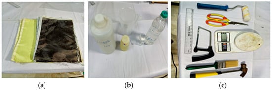 Figure 1 shows the equipment and tools used for fabricating composite. Synthetic fibers with good mechanical properties are widely and easily available. The fiber mat allows the polyester resin to flow between layers and increase the bonding capacity. To make glass, carbon and Kevlar fiber mats, measuring 300 mm in length and 300 mm in width, and 210 g fiber were used. General polyester was used as a catalyst and accelerator [10,11,12]. The matrix ratio of 10:1:1 resin and hardener provided the dual purpose of acting as a binder and curing the hybrid composite. Various properties of carbon and basalt fiber and polyester matrix are shown in Table 1 [13]. Polyester is used as matrix martial because it has low viscosity, low density, low cost, and mechanical properties similar to an epoxy matrix. Basalt fiber has greater impact strength, carbon fiber has greater strength compared to glass fiber, and polyester has better mechanical properties, so new developed hybrid composites will have better mechanical properties for structural applications and automobile parts.