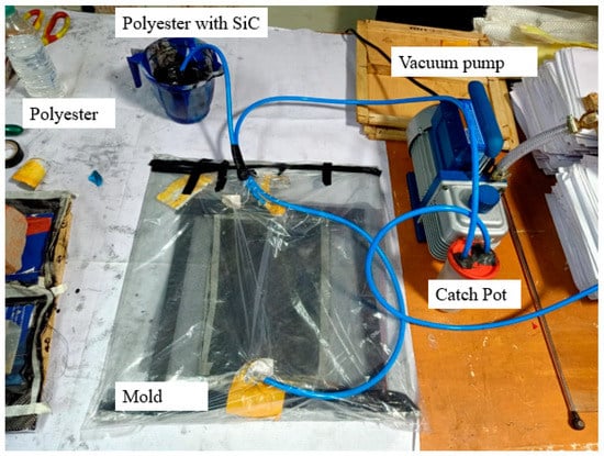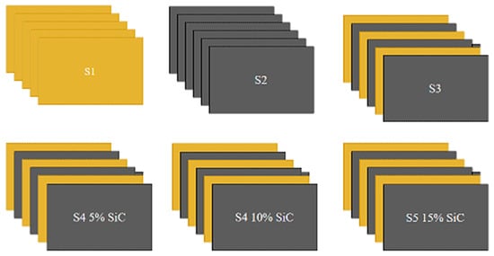 Reinforced polymer laminates (250 mm × 250 mm × 6 mm) were constructed using SiC nanoparticles as filler and a fiber-reinforced mat (basalt fiber), which was prepared with six layers of bidirectional carbon. Different stacking sequences used in manufacturing are shown in Figure 2.