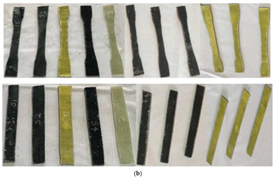 Figure 4 shows composite shield speared using varied stacking sequences. Tensile, flexural, impact, and DMA specimens were prepared in accordance with ASTM standards. The specimen’s size was 65 mm × 12.7 mm × 3 mm. The DMA experiments were carried out at temperatures ranging from −30 to 200 °C following ASTM Standard D4065-12. A dynamic automated temperature analyzer was used to calculate the storage modulus (E1), the loss modulus (E2), and the mechanical loss factor (tan delta) as a function of temperature (T). The specimens used to perform the DMA test are shown in the figure [18,19].