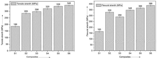 The tensile modulus of the CBCBCB sequencing composite laminate increased by 10% (from 320 to 334 MPa) due to incorporation of nanoparticles as an outer reinforcing material. This was in comparison to the fracture toughness of the CBCBCB sequence. It was observed that incorporating carbon fillers into composites results in an improvement in their tensile properties. A comparison of the tensile strengths of several composite materials is shown in Figure 6. Regarding the mechanical properties, the laminate with 15% filler between layers showed the strongest tensile strength of 346 MPa. S2 has a maximum strength of 280 MPa when compared to pure laminates. In contrast, the CBCBCB composite laminates, S3, S4, and S5, showed enhanced mechanical qualities due to an intermediate bonding film connecting fiber and particulate filler material. There was a 20% increase in the strength [32,33,34,35]. After discovering that the composite had the stacking sequence CBCBCB, it was decided that the experimental findings be discussed using subheadings with a clear and concise summary of the findings, their interpretations, and the inferred implications.