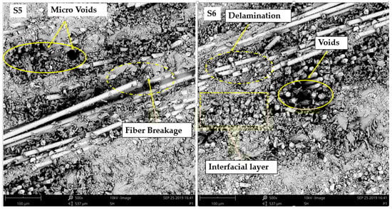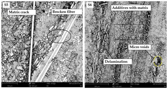SEM images of the S5 and S6 hybrid composites after flexural test.