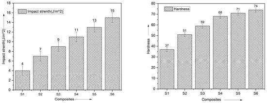 To perform and track the energy storage capabilities of a material, an Izod impact test was conducted. Forces of impact are seen to vary widely in Figure 9. The impact strength of hybrid composites S3–S6 is low compared to that of S1. To increase the impact strength, it is thought that the addition of successive layers of identical reinforcing fibers can increase stiffness [47]. All six layers of basalt threads and alternately stacked basalt fibers in ordinary laminated S2 and hybrid composite S1 boost the impact strength. Composite material S6, with sequentially layered basalt fibers placed between carbon fibers, absorbed the maximum energy (15 J) in any of the tested materials. Similarly, S3 structures included alternately stacked basalt strands and sandwiched basalt fibers [48,49,50].