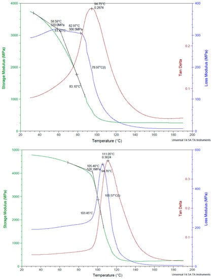 Figure 10 displays the dynamic mechanical study of a PMC [37,38,39]. This figure demonstrates how the storage modulus, E, of the analyzed composites varies due to temperature. The decrease in the storage modulus among all composites may be related to an increase in the deformability of the polymerization. This phenomenon is observed when the temperature is increased from its initial state.