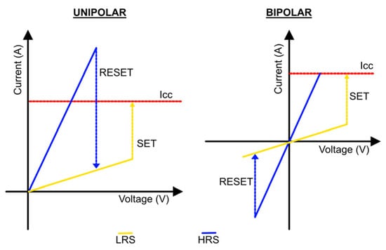 According to the current polarity, the RRAM can be divided into two modes: unipolar and bipolar (Figure 1). In unipolar switching, changing between modes does not depend on the polarity of the applied voltage. In bipolar switching, the SET and RESET processes rely on the polarity of the applied voltage. A switch from an HRS to an LRS occurs at one polarity (positive or negative) and the opposite polarity shifts the RRAM cell back into the HRS [3]. Resistance-switching properties in memristive devices were highly dependent on materials, device structures, external simulations, and switching mechanisms. Therefore, many reports deal with the adjustment of switching behavior characteristics by modifying the structure of the device and the simulation parameters [11,15].