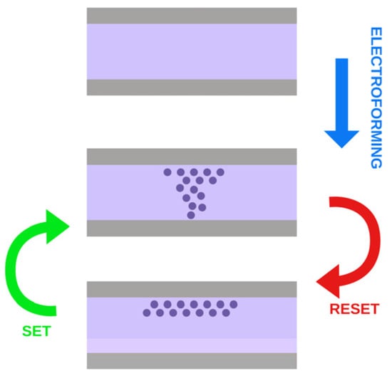 The RRAM behavior is based on the possibility of electrically modifying the conductivity of a stack of metal–insulator–metal (MIM). To activate the switching mechanism, some technologies require a preliminary formation operation [18], which is shown in Figure 2. The electroforming process (soft or hard) is usually realized by applying a large electrical bias across the two electrodes within a certain specific time interval to generate initial conductive channels via the Joule heating effect. The formation step can be conquered by appropriately modifying the fabrication process to readily introduce oxygen vacancies to facilitate the migration of anions within the switching layer [6]. Even if the forming process is performed once, this initial state plays a fundamental role in determining the subsequent array and system performance. The performance of the formation process relies on its ability to create homogeneous conductive conditions among cells, thus easing successive SET/RESET operations [18]. As explanations of the driving force of anion transport during the formation process, the following are suggested: (i) drift by electric potential gradient, (ii) electromigration assuming an electron kinetic energy, (iii) Fick diffusion due to ion concentration gradient, and (iv) thermophoresis due to temperature gradient [6].