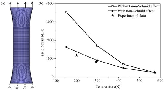 The NS effect on the yield stress of tungsten at different temperatures. (a) Boundary condition of the cylindrical dog-bone shaped specimen. (b) Predicted yield stress under the two conditions and the experimental data from [,].