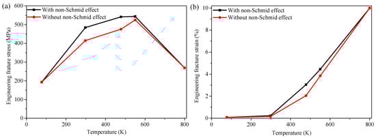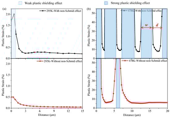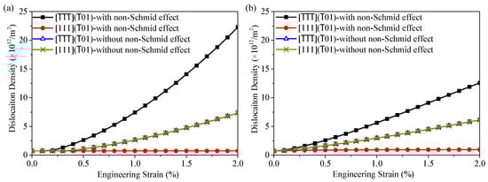 On the other hand, the NS effect also affected the uniformity of plastic deformation. The evolution of dislocation density in two active slip systems of and was taken as the example to illustrate this effect at temperatures of 295 K and 573 K. As shown in Figure 2, when the NS effect was not considered, these two active slip systems (with the same Schmid factor) had the same dislocation density evolution, contributing to the same plastic deformation while the NS effect led to different contributions of plastic deformation. The increase in the dislocation density in the slip system of was much faster than that of . This great difference is a direct manifestation of the heterogeneity of plastic deformation, and the higher possibility of localized deformation. By comparing Figure 2a,b, it can seen that the difference between and decreased when the temperature increased from 295 K to 573 K, indicating a weaker role of the NS effect in influencing plasticity at a higher temperature.