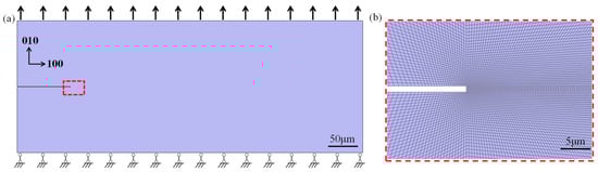 The notched single crystal tungsten sample. (a) The boundary conditions. (b) Enlargement of the mesh around the crack tip zone marked by the red dotted box in (a).