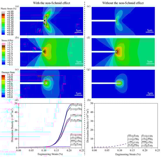 We further explored how the NS effect influenced the dislocation motion of the main slip systems suffering from the complex stress state in the crack-tip zone. For a given position (marked with “A” in Figure 5a), the corresponding evolutions of dislocation density under the two conditions are shown in Figure 5d,h, respectively. Without considering the NS effect, the dislocation density evolutions of the eight main slip systems were the same (see Figure 5h). In contrast, these eight slip systems had significant different evolutions. The slip system of , , and showed a much higher dislocation density than that of ignoring the NS effect and dominated the plastic deformation. This is consistent with Section 3, as the NS effect breaks the homogeneity of plastic deformation near the crack tip.