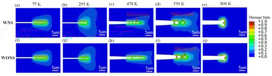 When the temperature increased to 550 K, the NS effect had a weaker effect on the fracture process of tungsten, and the two tungsten samples suffered from the micro-ductile fracture, as shown in Figure 6d,i. Note that the higher temperature of 550 K contributed to the larger distance between micro-cracks than that of 478 K by comparing Figure 6c,d.