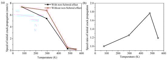 Influence of NS effect on the speed of crack propagation at different temperatures. (a) Speed of initial crack propagation from 77 K to 550 K. (b) Speed ratio of the initial crack propagation, which is the ratio of the initial crack propagation speed without the NS effect to the one with this effect and was calculated from (a).