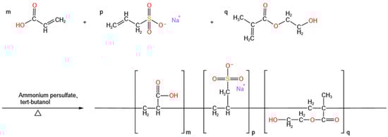 The copolymer HEMA-AA-SAS was synthesized using free radical polymerization of an aqueous solution. A three-port flask with a constant pressure drop funnel and a reflux condensing tube was placed in a water bath containing a magnetic stirrer and a thermometer. The concentrations of hydroxyethyl methacrylate, acrylic acid, sodium allyl sulfonate (total mass of copolymer is 6 g, configured in molar ratios of HEMA:AA:SAS = 1:6:1, 1:8:1, 1:10:1), and tert-butanol were added to a three-necked flask with a magnetic stirrer turned on and the temperature set at 80 °C. A certain concentration of ammonium persulfate was added into a constant pressure funnel, and controlling its dropping speed, keeping the temperature for a certain time after dropping, making the solution uniformly react completely. Naturally cooling to room temperature, a pale yellow transparent liquid can be obtained; adding potassium hydroxide solution to the copolymer to adjust pH to 5.0, after anhydrous ethanol precipitation, the yellow viscous liquid at the bottom of the solution was dried at 50 °C after vacuum extraction and filtration, then the purified copolymer corrosion and scale inhibitor was obtained. The synthesis process is shown in Figure 1.