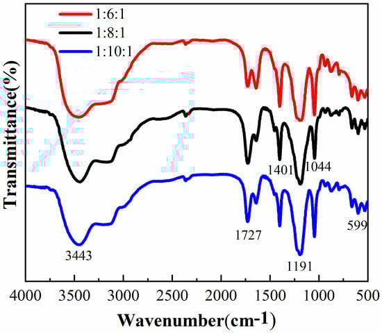 Figure 2 is the infrared spectrum of the copolymer synthesized using monomers with different ratios. The FTIR spectrum shows the following absorption bands: 599.1 cm−1 (-C-S stretching vibration absorption peak); 1401 and 1044.5 cm−1 (both peaks belong to sulfonic acid group); 1191.5 cm−1 (-C=O symmetric stretching vibration absorption peak); 1727.9 cm−1 (-C=O stretching vibration absorption peak); 3443.0 cm−1 (the peak belongs to the hydroxyl group). It shows that the copolymer corrosion and scale inhibitor contains a large number of carboxyl groups, and the scale inhibition effect on calcium carbonate is better. It shows that the copolymer corrosion and scale inhibitor contains hydroxyl groups. Based on the above analysis, it shows that the copolymer corrosion and scale inhibitor synthesized under optimized conditions meets the design concept.