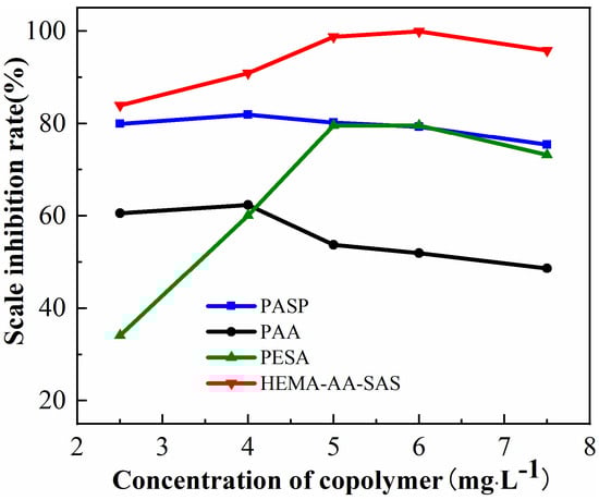 As shown in Figure 3, the scale inhibition rate increases with the increase in HEMA-AA-SAS concentration. Polyaspartic acid (PASP), (PAA), and polyepoxysuccinic acid (PESA) are industrially pure, supplied by the Shandong Province Taihe Water Treatment Co. The scale inhibition rate reaches 99% when the concentration of the scale inhibitor is 6 mg/L. After that, the scale inhibitor decreases with the increase in scale inhibitor concentration, but the scale inhibition effect is still above 90%. When the concentration of the scale inhibitor increases, the content of the functional groups gradually increases, and the scale inhibition effect also steadily increases. However, when the concentration of the scale inhibitor is too high, the functional groups in the molecule agglomerate due to polarity effects [18]. Moreover, the hydrogen bond formed between the functional groups and the oxygen atoms on the surface of the crystal increase the repulsive force by increasing the charge. When the concentration is too high, the repulsion between the crystals will be weakened, and the scale inhibition effect will not continue to increase, indicating that there is a threshold effect of the scale inhibitor [19]. Compared with other commercially available scale inhibitors, HEMA-AA-SAS has the best scale inhibition effect at the same concentration. The reason is that the functional group contained in the copolymer molecule complexes with calcium ions to form a water-soluble compound [20].