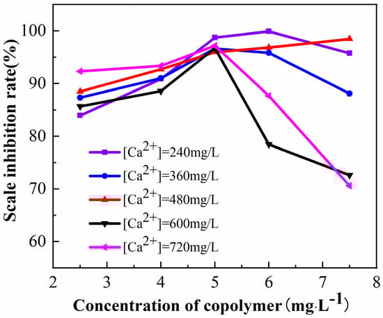 Figure 4 shows that when the copolymer dosage is at low concentration, it has a better scale inhibition effect on CaCO3 scale. The functional group such as a carboxyl group contained in the solution forms a chelate compound soluble in water with Ca2+ to reduce the formation of calcium scale. With an increase in the concentration of scale inhibitor, the scale inhibition effect of water samples with different calcium ion concentration mainly increased at first and then decreased. Compared with the water samples of higher calcium ion concentration, when the water samples with lower calcium ion concentration achieve the optimal scale inhibition effect, the continuous increase in the dosage of the copolymer is less affected. When the calcium ion concentration exceeds 600 mg/L, the scale inhibitor concentration exceeds 5 mg/L. As the calcium content in the water sample increases, the formation of calcium carbonate is promoted, and a polarity effect is likely to occur when the concentration of the scale inhibitor is large. The repulsion between the calcium carbonate grains is weakened, so that the scale inhibition rate will be greatly reduced.