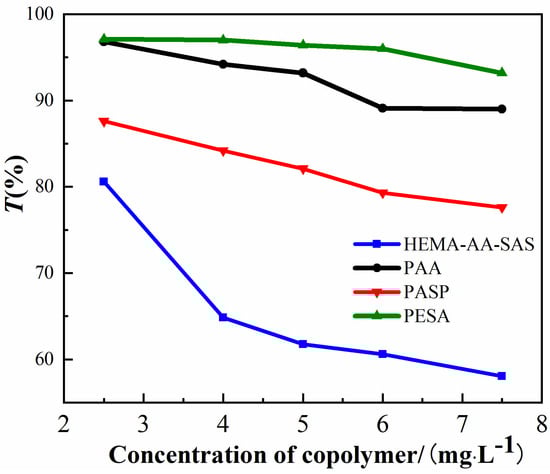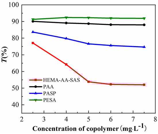 Different solutions were prepared: CaCl2 solutions, FeSO4·7H2O solutions, and copolymer scale inhibitor solutions with different concentrations, so that C[Ca2+] = 200 mg/L, C[Fe2+] = 20 mg/L. The concentration of sodium tetraborate was 15.2 g/L to adjust pH to 9, at a constant temperature water bath at 80 °C for 5 h. Solutions were filtered after cooling, and the supernatant was taken and the light transmittance of the solution was measured with a spectrophotometer at 420 nm.