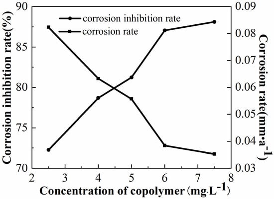 The concentration of copolymer was 7.5 mg/L, and other conditions remained unchanged. The effect of copolymer dosage on corrosion inhibition is shown in Figure 7.