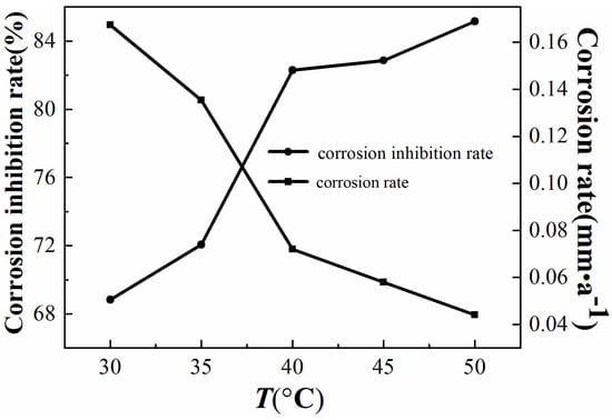 The concentration of the copolymer was 7.5 mg/L, and other conditions remained unchanged. The effect of the reaction temperature on the corrosion inhibition of copolymers is shown in Figure 8.