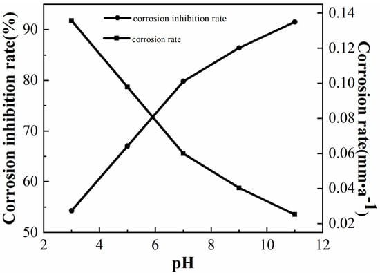 The change in pH value in the water sample has a great influence on the corrosion inhibition effect of the copolymer because of the solubility of metal oxides will be affected in different pH environments [23]. The result of the pH value in the water sample on the corrosion inhibition effect of the copolymer is shown in Figure 9.