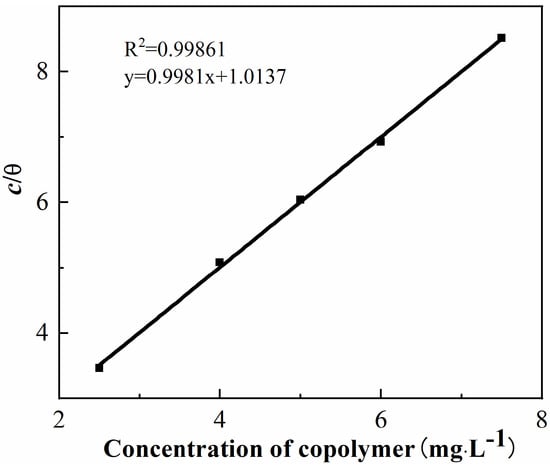 As shown in Figure 13, the R2 linear regression coefficient is 0.99861 close to 1. It shows that the adsorption of copolymer molecules on carbon steel hangings follows the Langmuir adsorption isotherm. The carboxyl sulfonate groups in the copolymer HEMA-AA-SAS formed a coordination bond with the D empty orbital of the iron atom [28], which formed a single molecule adsorption layer on the surface of carbon steel and effectively inhibited the corrosion reaction of carbon steel. The calculated adsorption equilibrium constant is 10.17 L/mg−1.