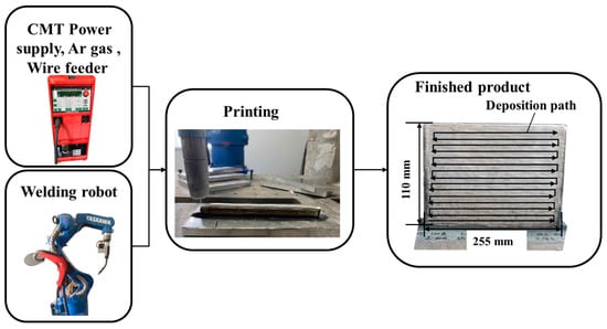 The schematics of the process are shown in Figure 1. Fuse additive deposition tests were performed using a TransPlus Synergic 5000 Cold Metal Transfer Welding machine (Fronius Intelligent Equipment Co., Ltd. Wells, Austria) and a six-axis robot and robot control cabinet (YASKAWA Electric Corporation; Kitakyushu, Fukuoka, Japan). Samples with dimensions of 250 mm × 3 mm × 110 mm were built by CMT.