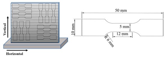 The schematics of the sampling process and the tensile test sample are shown in Figure 2. Room-temperature testing was carried out using an AG-X plus 100 KN (Shimadzu; Tokyo, Japan) at a cross-head displacement rate of 1 mm/min, according to the GB/T-228.1-2010 standard.