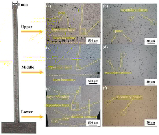 Figure 3 shows the microstructure of the longitudinal section of the deposited 5183 Al alloy plate. A layered structure can be clearly seen in Figure 3. Figure 3a,b display a series of pores and some secondary phases in the upper region. As shown in Figure 3c,d, the number of pores and the size of the secondary phases are significantly lower in the middle region. Few pores are present in the bottom part of the deposited Al alloy plate, and secondary phases appear granular in this region (Figure 3e,f). In addition, the α-Al matrix shows strong dendritic structures across the section of the deposited Al plate (Figure 3e).