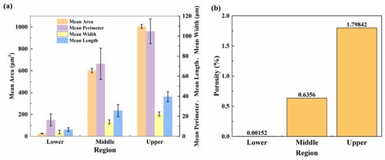 Figure 4a shows the mean area (MA), mean perimeter (MP), mean length (ML), and mean width (MW) of pores and porosity of deposited samples in different regions. The porosity ρ was calculated as follows: