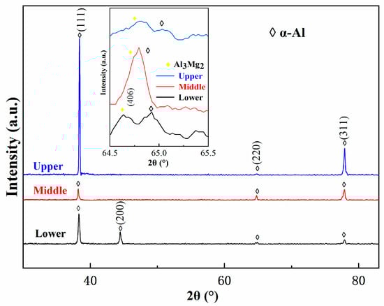 Along with the high intensity of the X-ray diffraction peak of the (1 1 1) crystal plane of α-Al in Figure 5, these results indicate a strong macroscopic orientation of the (1 1 1) crystal plane of α-Al in the upper region. The deviation of the (1 1 1) crystal plane at the three regions in Figure 5 was attributed to the elemental Mg in the upper region being dissolved in the Al matrix.