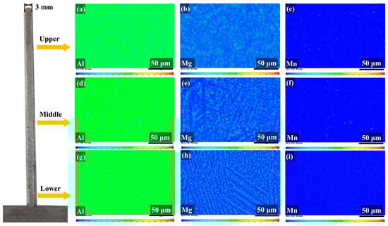Figure 6 shows the elemental distribution profile obtained using EPMA. Figure 6a–c indicate that Mg and Mn elements are uniformly distributed in the Al matrix in the upper region. From the top to the bottom region, the distribution of Mg is clear in the form of dendritic structures. Further, as shown in Figure 6d–i, the Al and Mn elements remain evenly distributed.