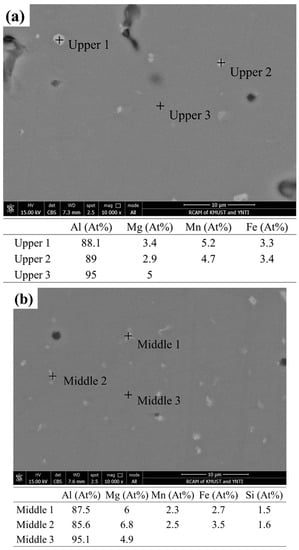 In Figure 7 and Figure 10, secondary phases with different microstructures are found to be distributed in the matrix. The secondary phases in the upper region are larger than those in the lower region. In addition, along the deposition direction, the size of the secondary phase increases and the distribution gets lower (see Table 7); because the fine, dispersed secondary phase Al6(Mn, Fe) precipitates at the grain boundary, this hard secondary phase presents a strong obstacle to dislocation motion, so the migration of the grain boundaries is difficult. The precipitation of these micro- and nanoscale secondary phases leads to strength improvement by the Orowan strengthening mechanism [41,42].