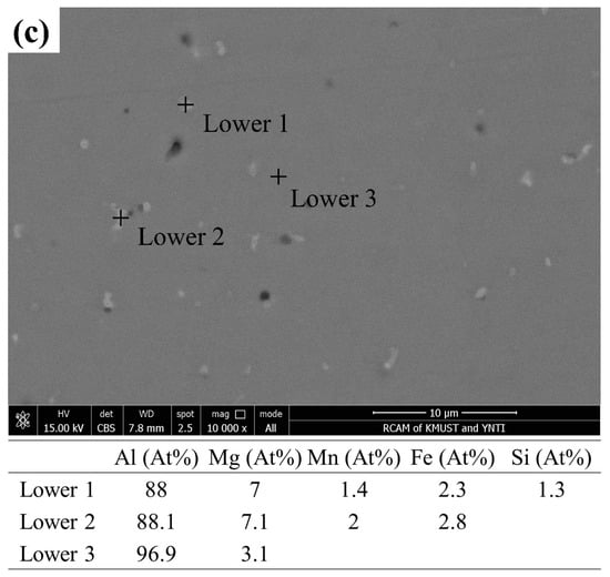 SEM of the deposited 5183-Al plate: BSE in the (a) upper, (b) middle, and (c) lower regions. Chemical compositions (at %) of the corresponding second phases and the Al matrix.