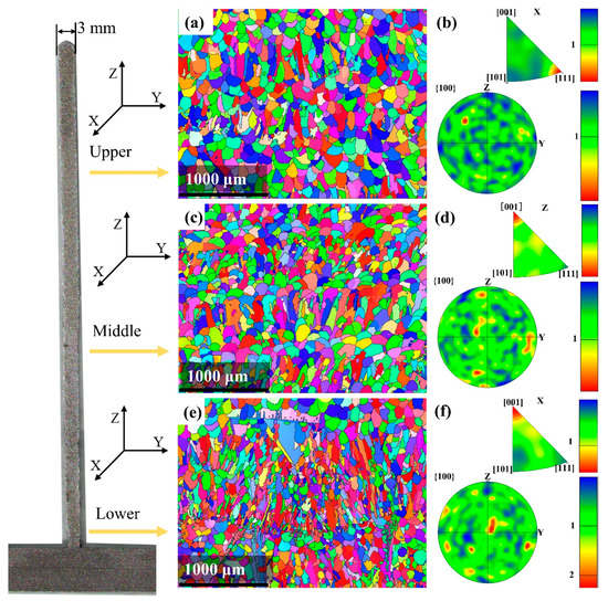 Figure 8 shows the EBSD grain orientation maps of different regions of the deposited plate and the corresponding pole and inverse pole diagrams. As shown in the orientation imaging maps (Figure 8a,c,e), the morphologies of the grains from the different deposited regions are different.