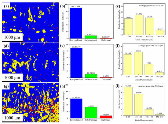 Distribution fraction of recrystallized grains: (a,d,g) recrystallization distribution maps of upper, middle, and lower regions; (b,e,h) recrystallization distribution maps of upper, middle, and lower regions; and (c,f,i) grain diameter distribution of upper, middle, and lower regions.