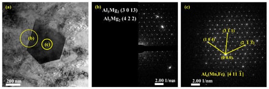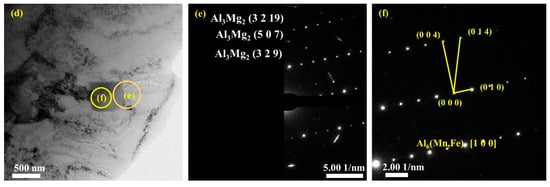 In the different regions of the deposited plate, the small amount of precipitated Al3Mg2 phase in the Al matrix was also examined. The corresponding lattice planes of these nanoscale polycrystalline precipitates are as shown in Figure 10b,e.