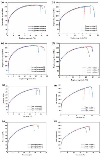 Tensile properties of the as-deposited Al–Mg–Mn plate and fracture position of the tensile test specimen: stress–strain curve of the upper region: (a) horizontal specimen and (b) vertical specimen; stress–strain curve of the lower region: (c) horizontal specimen and (d) vertical specimen. The real tensile curve of the upper region is: (e) horizontal specimen and (f) vertical specimen; the stress–strain curve of the lower region is: (g) horizontal specimen and (h) vertical specimen.