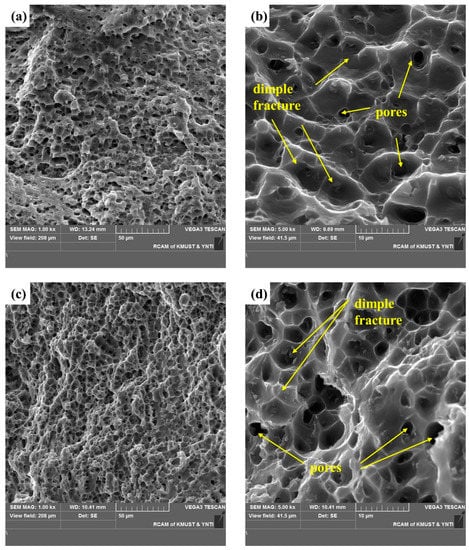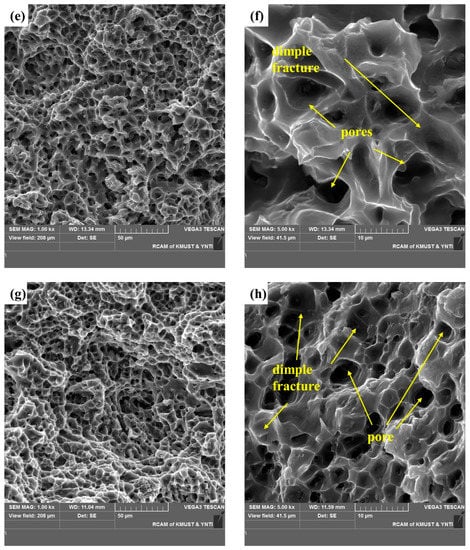 A cross-sectional SEM image of the selected area in Figure 12 shows shallow and uniform equiaxial dimples typical of ductile fracture. Smooth dimples without exposed columnar dendrites are evidence of micropore nucleation, growth, and polymerization on the fracture surface. In Figure 12a, the tearing edge is inclined, indicating a tearing dimple. The diameter and depth of the dimple depend on the size and number of the second-phase particles, their ability to undergo plastic deformation, the strain-hardening index of the matrix material, and the magnitude and state of the applied stress. Figure 12b,d shows the distribution of the secondary phase and pores in the dimples. Figure 12f,h shows finger-like protrusions (a typical pore) and indicates that the existence of pores makes fracture easier. Figure 12 demonstrate a typical plastic fracture, and the fractured surface shows fracture dimples and pores.