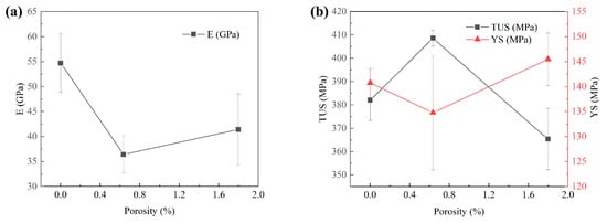 In Figure 13a, as the porosity decreases, the elastic modulus also gradually decreases, but when the porosity gradually increases, the elastic modulus increases. It shows that the correlation between porosity and E is low. In Figure 13b, with the increase in porosity, TUS decreases and YS increases. It shows that with the increase of porosity, elastic modulus decreases. The AA5183 alloy sheet prepared by CMT has low porosity and is not a porous material. The relationship between porosity and elastic modulus cannot explain the change in elastic modulus. However, the average E in the lower region is 18.6% higher than that in the upper region, which indicates that the porosity will affect the elastic modulus of the tensile pattern.