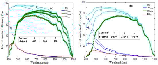 As shown in Figure 2a for different base widths, different quantum efficiency results can be seen. Once the base width rises, the contribution of the base to the quantum efficiency also increases, meaning that the quantum efficiency is a function of the base width. However, the contributions of the emitter (front) and space-charge region are practically unchanged. The variation of the base thickness (400, 300, and 200 µm) affects the quantum efficiency in the wavelength ranging from 530 to 1100 nm. The total quantum efficiency can be enhanced up to 20% at this wavelength, as shown in Figure 2a. The quantum efficiency versus the front surface recombination velocities Sf is presented in Figure 2b. One can notice the contribution of the front surface recombination velocities Sf to the silicon solar cell quantum efficiency drops significantly in the short wavelength range [400–530 nm] when the Sf rises, while not influenced by the quantum efficiency of the base and Scr. Therefore, the total silicon solar cell quantum efficiency decreases with increasing Sf in wavelength interval [530, 1100 nm].