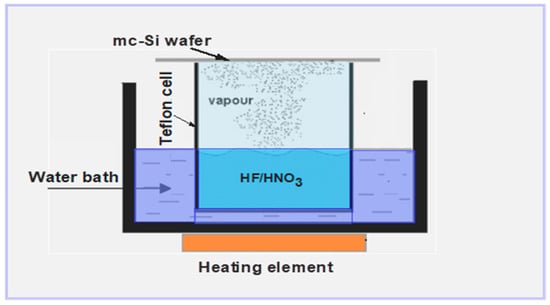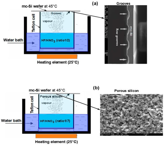 In this study, industrial p-type mc-Si Czochralskyc (CZ)-grown crystalline wafers having a thickness of about 400 µm, an effective area of 4 cm2 and a resistivity in the range of 0.5–2.0 Ω cm, were used. A simple, effective, and developed vapor etching process was employed to perform rear silicon grooves and thin porous silicon. The vapor etching practice is achieved in a Teflon Cell located in a special hood taking a filter exhaust fan system seen in Figure 3.