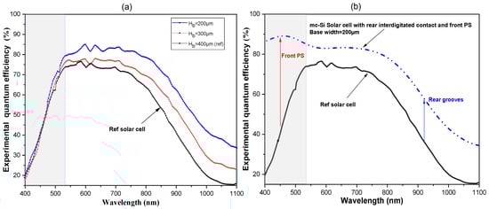 Thick silicon solar cells suffer from unavoidable losses in quantum efficiency due to the non-radiative recombination of photo-generated charge carriers during their relatively long path to electrical contacts at the extremities of the cell. It means that varying the base width affects the bulk recombination and the collection probability of the photo-generated charge carriers. Based on this fact, the structure’s electrical and optical performance will change. The first point is interesting to investigate the effect of rear interdigitated contact on the mc-Si solar cells quantum efficiency, especially in the long wavelength range (base region). Figure 5a illustrates mc-Si solar cells’ quantum efficiency for a reference cell with a width base of 400 µm compared to mc-Si solar cells having a width base of 300 and 200 µm. It can be observed that the achievement of rear-buried metallic contacts affects the mc-Si solar cells’ quantum efficiency in the 530 to 1100 nm wavelength range by reducing the effective thickness of the base, leading to an increase in the collection probability of the minority carrier at long wavelengths (580–1100 nm spectral range), and then to an enhancement of the mc-Si solar cells quantum efficiency in this spectral region. As a results, the mc-Si solar cells’ quantum efficiency can be enhanced up to 25% at the 530–1100 nm wavelength range. The rear interdigitated contact design allows for more efficient charge carrier extraction by providing a large surface area for contact and reducing the distance traveled by the charge carriers to reach the contacts. In summary, the base width is an essential parameter in the design and optimization of silicon solar cells, and it significantly impacts the cells’ performance and quantum efficiency. A thinner base width generally leads to higher efficiency and better performance.