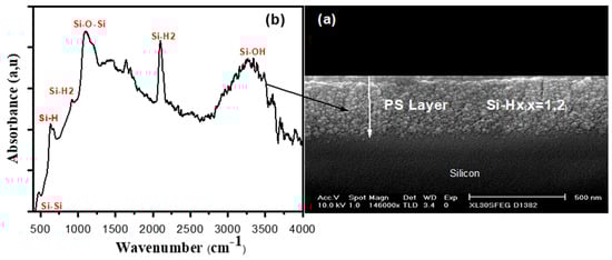 (a) SEM surface view of mc-Si after PS formation, (b) FTIR spectra of PS.