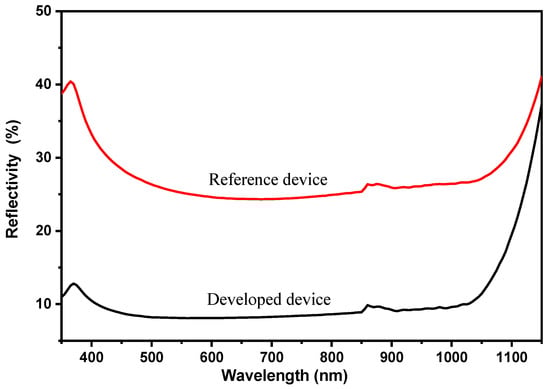 Using a front-thin porous silicon layer on a silicon solar cell can have several benefits, including improved light trapping, passivating the front surface, and reducing recombination losses on the front side of the silicon cell. Additionally, as can be seen in Figure 5b, the application of a thin PS layer by vapor etching method in the front surface of the mc-Si solar cells enhanced the quantum efficiency at a short wavelength range (400–530 nm), where this improvement could be due to the surface recombination velocity diminution via the hydrogen-rich PS layer (Figure 6a) front surface passivation [,,,] and validated by the presence of Si-H bands in the PS layer showed in Figure 6b. Consequently, the quantum efficiency of the mc-Si solar cells was enhanced by over 50% at a short wavelength range compared to mc-Si solar cells without PS. Moreover, the front-thin porous silicon layer serves to reduce the reflectivity of the cell, thereby increasing the amount of incident light that is absorbed by the active region of the silicon solar cell []; where observed in Figure 7, the surface reflectance decreased from 29% for the reference device to around 9% for the developed device.