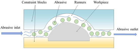 Abrasive flow machining is an untraditional processing technology that uses fluid as a carrier, and in which abrasives are suspended to form an abrasive flow. Material is then removed from the target via the microcutting action of the abrasive relative to the target surface [12,13]. The abrasive flow usually employs a weak viscous fluid as a carrier, while the irregular turbulent motion of the abrasive particles within the flow impact the target surface in a disorderly manner to achieve a good surface finish [14,15,16,17,18]. Davies et al. [19] investigated the rheological and thermal properties of liquid carrier materials in abrasive flow machining and found that the variation in viscosity caused by the rheological and thermal properties of liquid affected the polishing efficiency and quality. Xu et al. [20] investigated the rheological properties and polishing performance of viscoelastic materials for the dilatancy pad, and found that the material underwent a shear thickening effect when subjected to a shearing force, exhibiting a significant shear-stiffening performance. Williams et al. [21] explored the properties associated with the abrasive flow machining process, modeled the abrasive flow machining process, and investigated the effect of processing parameters on the polishing performance. Qi et al. [22,23] proposed a novel hydrodynamic suspension polishing and acoustic levitation polishing to control particle impact erosion on the target surface and achieve an ultrasmooth surface.