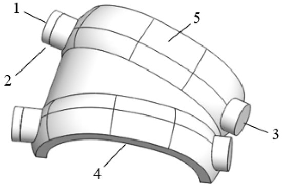 Model and boundary conditions: 1—runner inlet; 2—initial interface; 3—runner outlet; 4—upper surface of artificial knee joint; 5—constrained flow channel surface.
