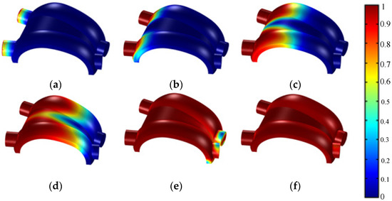 Abrasive flow process with respect to simulation time: (a) t = 0 s; (b) t = 0.005 s; (c) t = 0.01 s; (d) t = 0.015 s; (e) t = 0.025 s; (f) t = 0.1 s.