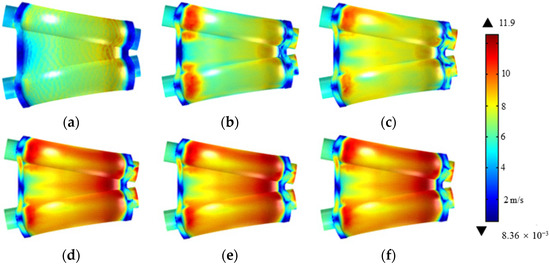 Distribution of abrasive flow velocity across upper surface of artificial knee joint: (a) t = 0 s; (b) t = 0.005 s; (c) t = 0.01 s; (d) t = 0.025 s; (e) t = 0.05 s; (f) t = 0.1 s.