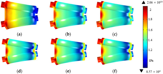 Distribution of abrasive flow pressure on upper surface of artificial knee joint: (a) t = 0 s; (b) t = 0.005 s; (c) t = 0.01 s; (d) t = 0.025 s; (e) t = 0.05 s; (f) t = 0.1 s.
