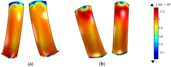 In addition, the Preston equation states that the material removal rate on the workpiece surface is directly proportional to the cutting speed (V) and loading pressure (P). The material removal mechanism of the abrasive flow machining could be considered to be the microcutting action of abrasive particles on the target surface, where the cutting speed and loading pressure of abrasive particles relative to the target surface actually correspond to the velocity and pressure of the abrasive flow. Therefore, a dimensionless material removal rate model, M = PV/min, was developed to explore the relative machining performance according to the above distribution of abrasive flow velocity and pressure obtained from simulation results. Figure 8 shows the dimensionless material removal rates for the two main machined surfaces, i.e., surface A and surface B in Figure 1b. In order to accurately demonstrate the simulation results, two cases are illustrated in Figure 8, where, in case one, the lower part was set as the inlet and the upper part was set as the outlet, and in case two, the inlet and outlet were set in the opposite positions. It can be seen from Figure 8 that the relative material removal rate near the inlet of the constrained flow channel was relatively large, and the relative material removal rate at the outlet of the constrained flow channel was relatively small. It was also found that in the middle part of the constrained flow channel, the relative material removal rate seemed to be uniform, but in order to realize a good abrasive flow machining performance with a relatively uniform material removal rate across the whole surface, it was recommended that the exchange of the abrasive flow inlet and outlet was necessary.