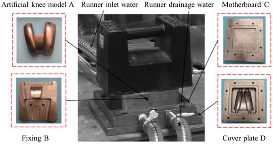 Figure 9 shows the experimental setup, which included the titanium alloy artificial knee joint model A and three restraining parts B, C, and D. The artificial knee joint model A was installed on restraining part B with screws and then both parts were embedded together on base plate C, which was then covered with cover plate D. The small square groove on part C was used for applying the sealant, cooperating with the square protrusion in D to realize the sealing function.